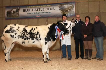 WITH 70% CLEARANCE FOR QUALITY BULLS The Northern Ireland Blue Cattle Club were honoured to invite Gail Ellis from the Trencrom Herd, St Ives, Cornwall, to judge their Autumn Show & Sale of Pedigree Blues on Saturday 3rd November 2012. Her task being made even the more difficult, by the quality of animals before her. The Supreme Champion and Champion Male of the day being Ballyhossett George ET, a March 2011 born son of Empire D’Ochain, out of Knockagh Whoopee ET, bred & exhibited by Jason & Jennifer Edgar: Being in the top 10% in the breed for calving ease, with one of the lowest recorded birth weight EBV’s and also being in the top 30% of the breed for Carcass Yield Index. Ballyhosset George then went on to be knocked down to Neil & Irene Armstrong, from Silloth in Cumbria for 5,000gns and will join their “Goodyhills” Pedigree Blue Herd, recent winners of the Border British Blue Club Herd Competition.