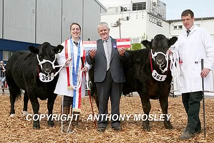 Presentation by the Judge, J McMordie, to Jeff & Lorraine Dunn for their Interbreed Beef Pairs Champions: Homebred sisters Highridge Blues Glisten (left) and Highridge Blues Glitter (right). Glitter was also Reserve Breed Champion.